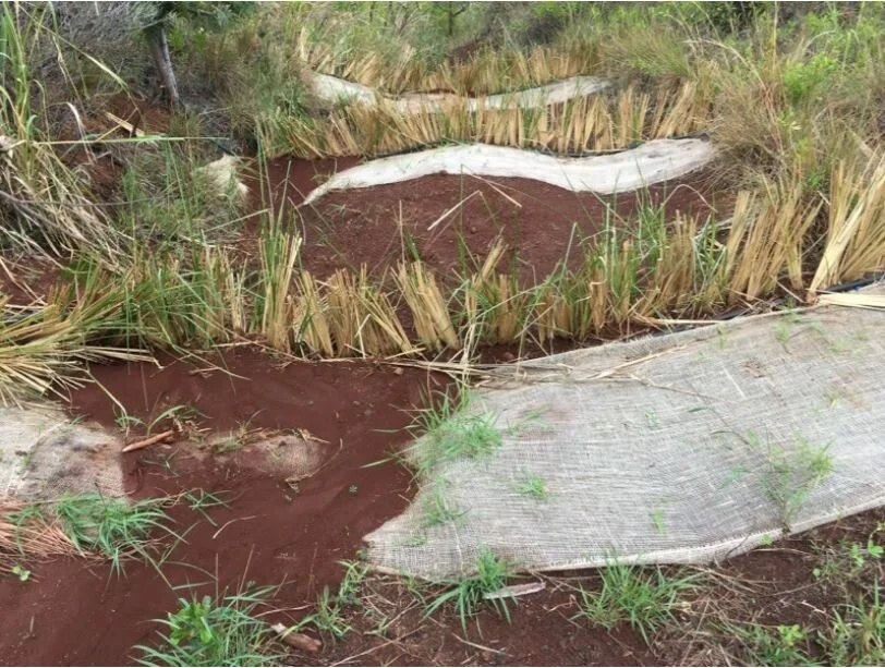 Vetiver grass rows are planted perpendicular to the direction water flows downhill; this traps sediment before it flows into a sensitive coral reef system. Rainwater catchment systems feed the drip irrigation system and optimize growth of the sediment trap.